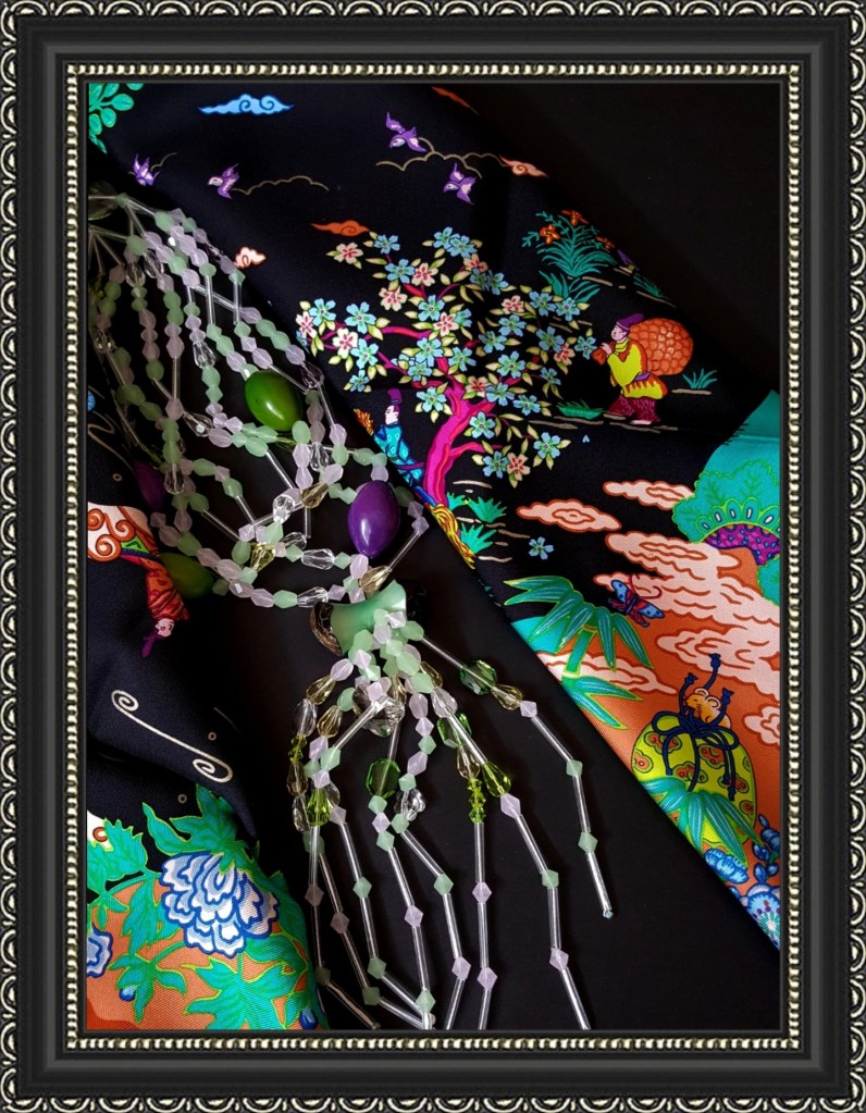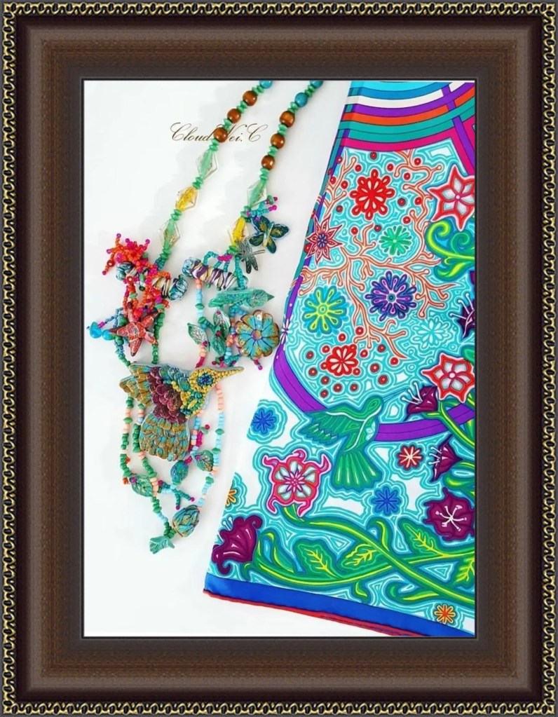 Not only does CloudWei work as a bridge between art and language, but she also transforms the art into jewellery from her perspective. As an artist, she would pay attention to the details and create one-of-a-kind jewellery specifically to match her scarf collection. She supports fair-trade organisations, women’s living organisations, rainforest conservation and indigenous communities, etc. In most of her projects, she uses eco-friendly & recycled materials. To match the details on the scarves, sometimes she would create the specific elements for the jewellery, even tiny beads.