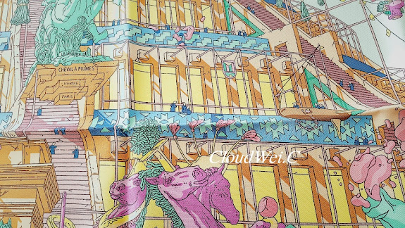 Hermès’ booklet: “Ugo Gattoni invites us into a fantastical city populated by small, strangely human horses. At the foot of an imaginary pyramid reminiscent of the Tower of Babel, a multitude of characters roams through a futuristic cityscape aboard hovering shuttles, flying boats, and galloping aircraft. Inspired by the Mexican folklore that is so dear to him, the artist punctuates this exuberant metropolis with a musician in a sombrero, a traditional dancer, and cacti.”