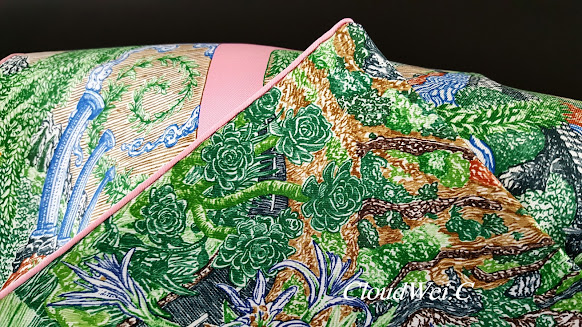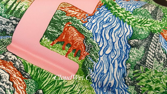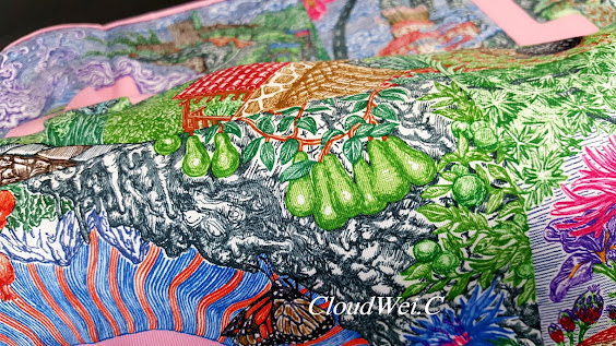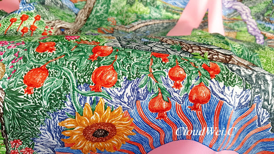 Laurel tree, sunflower, hyacinth, pear, pomegranate, goat, and other flora and fauna of Greece depicting Greek Gods’ love, hatred, passion and desire in Greek mythology are elegantly painted in the Hermès carré Eleftheria.